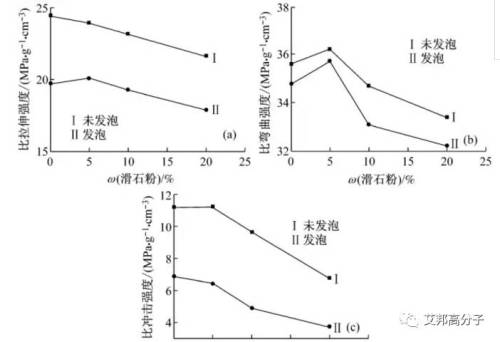 比强度是衡量材料轻质、高强的重要指标。由上图可知:相比于纯PP材料,滑石粉的质量分数为5%的未发泡PP材料的比拉伸强度降低,比弯曲强度增加,比冲击强度基本不变;随着滑石粉的质量分数进一步增加,材料的比拉伸强度、比弯曲强度和比冲击强度均降低