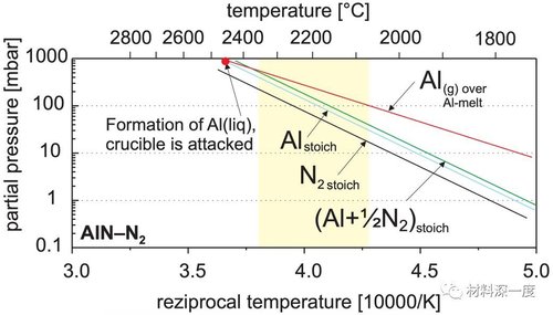 图1 PVT法生长氮化铝单晶工艺窗口(生长气压、温度倒数之间关系)